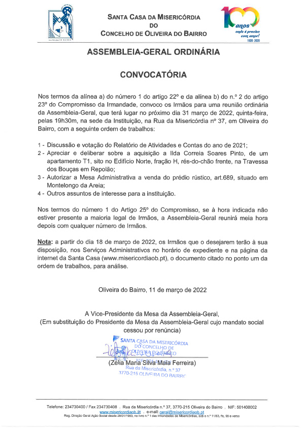 Nos termos da alínea a) do número 1 do artigo 22º e da alínea b) do n.º 2 do artigo 23º do Compromisso da Irmandade, convoco os Irmãos para uma reunião ordinária da Assembleia-Geral, que terá lugar no próximo dia 31 março de 2022, quinta-feira, pelas 19h30m, na sede da Instituição, na Rua da Misericórdia nº 37, em Oliveira do Bairro, com a seguinte ordem de trabalhos: